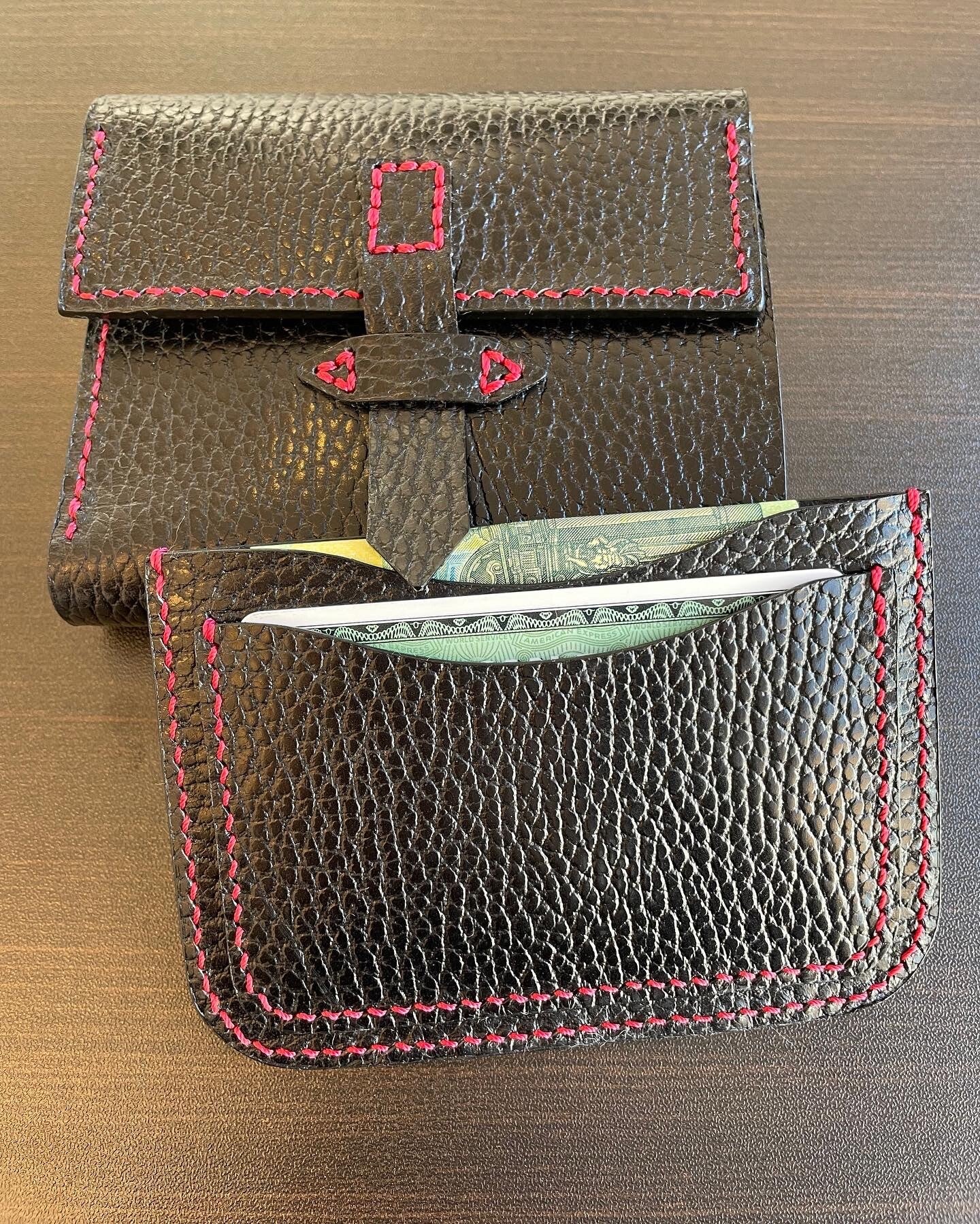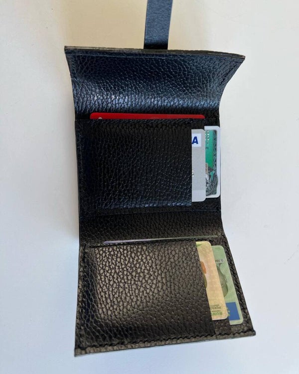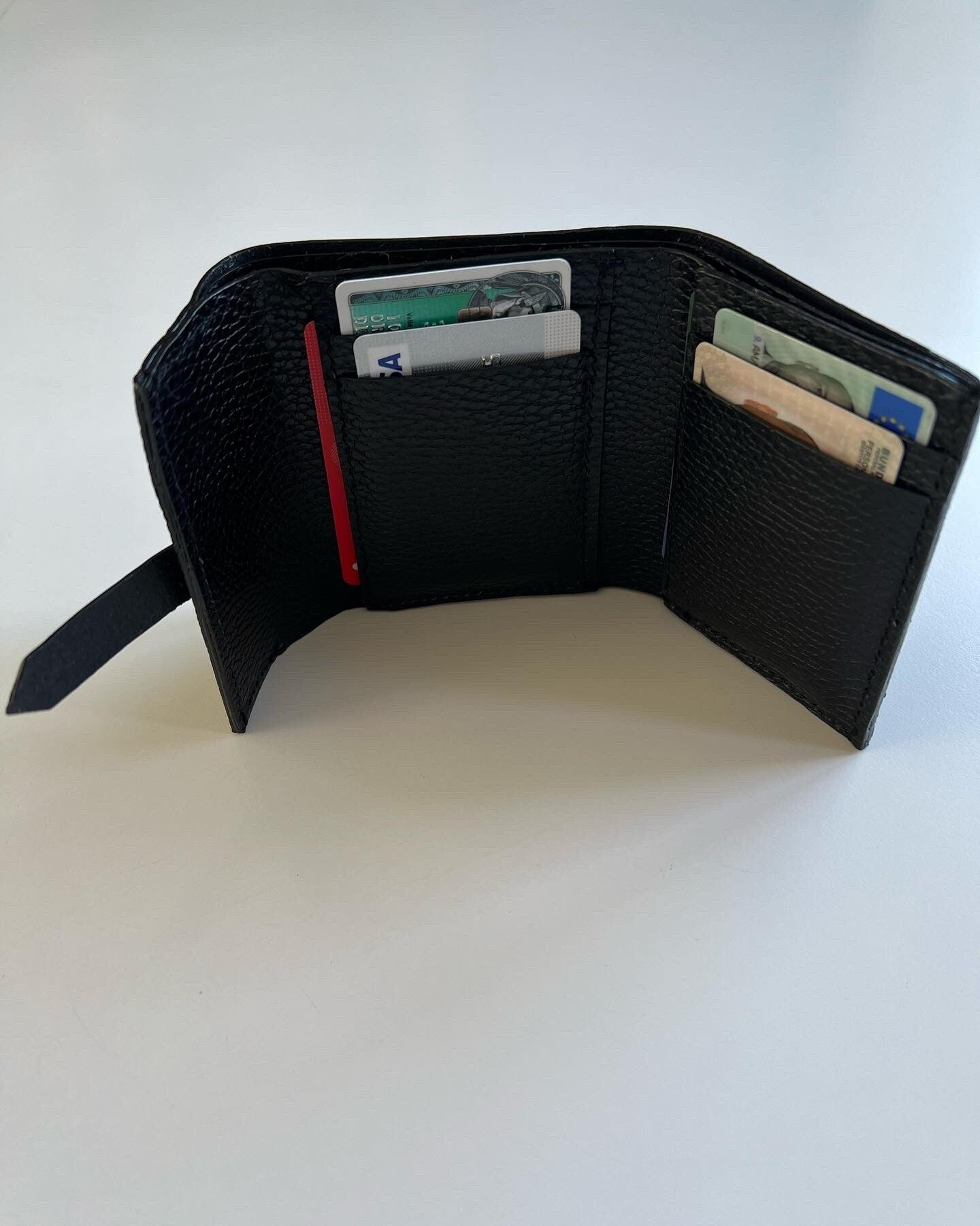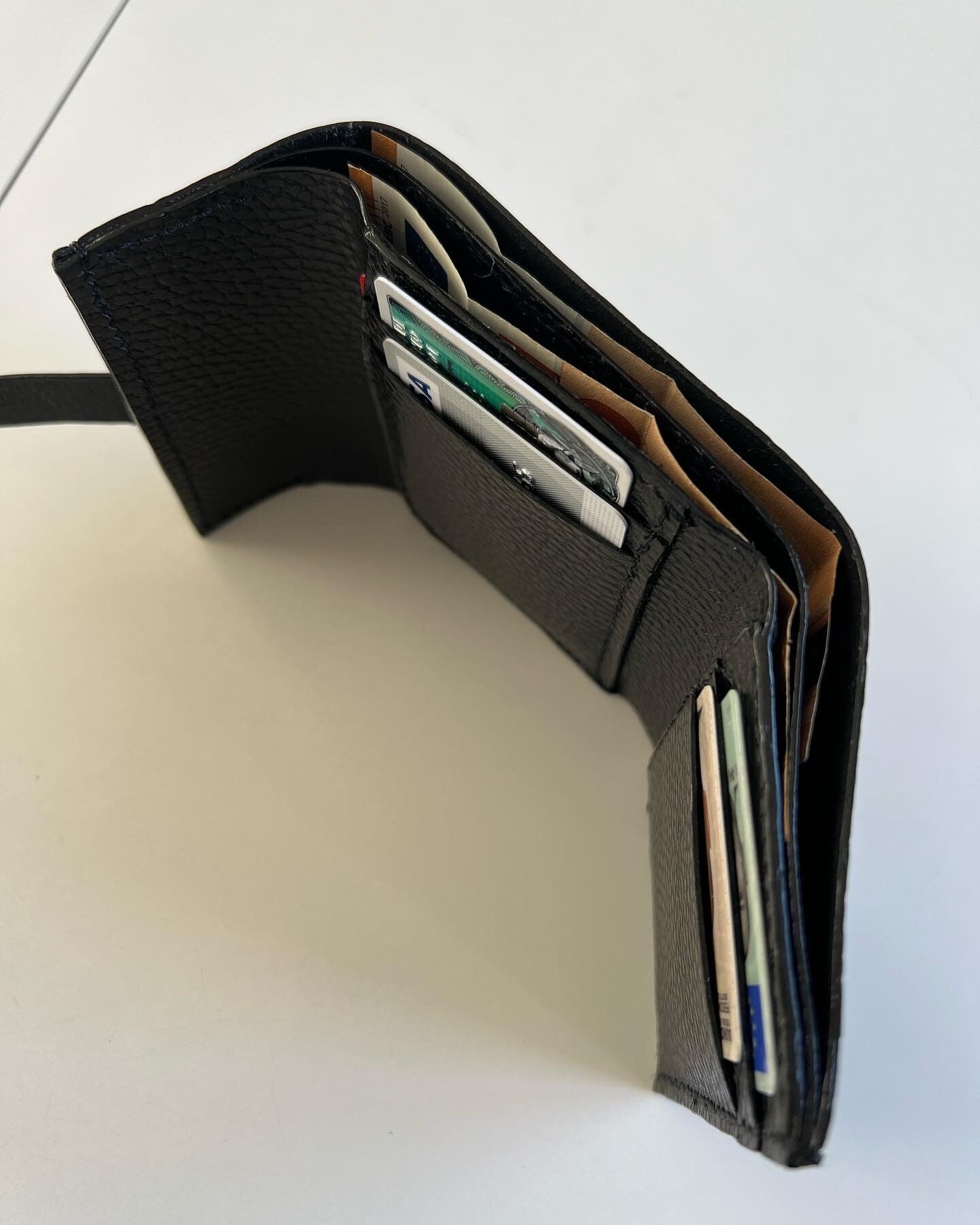 Brieftasche mit 2 Fächern für Geldscheine und 6 Fächern für Kreditkarten in Rot, Grün oder Schwarz.