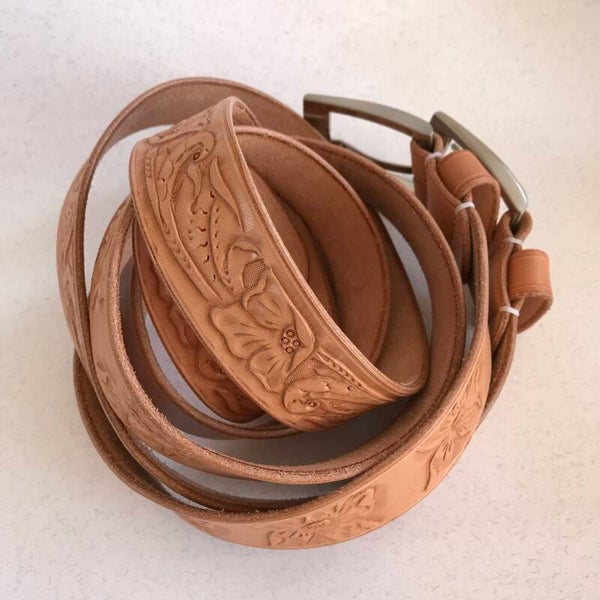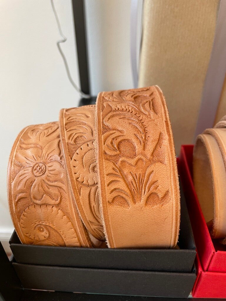 Naturbelasserer Gürtel mit verschiedenen Motiven per Hand geschnitzt in den Breiten 3,5 oder 4,0 cm ab 249,00 €.